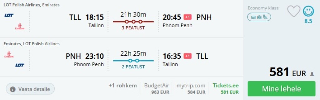 Emirates pakub hetkel lende Tallinnast Kambodža pealinna Phnom Penhi hinnaga alates 581€. Kõik lennud on kiirete ümberistumistega. Minnes on lisaks ka lühike vahemaandumine Myanmari pealinnas Yangonis. Soodsaid lende leiab jaanuari lõpust märtsi lõpuni ja näib, et otsida tasub pileteid väljumistega pühapäeval ja kohati ka reedel. Tallinnast Stockholmi on Nordica lennud.