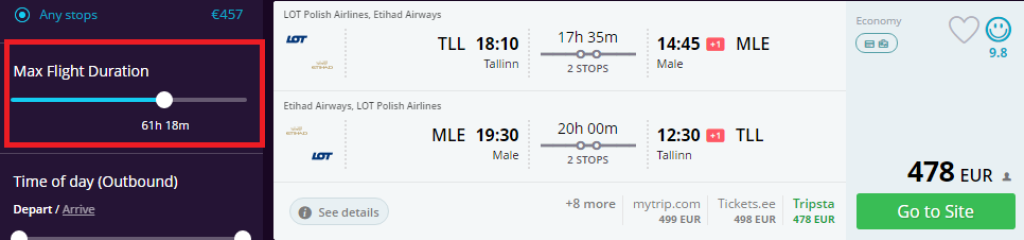 NB! Momondo kuvab soodama hinnaga pileteid eelisjärjekorrasn(pikad ümberistumised). Selleks aga, et leida paremate lennuaegadega piletid, tuleb vasakpoolses menüüs vastava nupu "Max Flight Duration" abil lennuaega optimeerida.