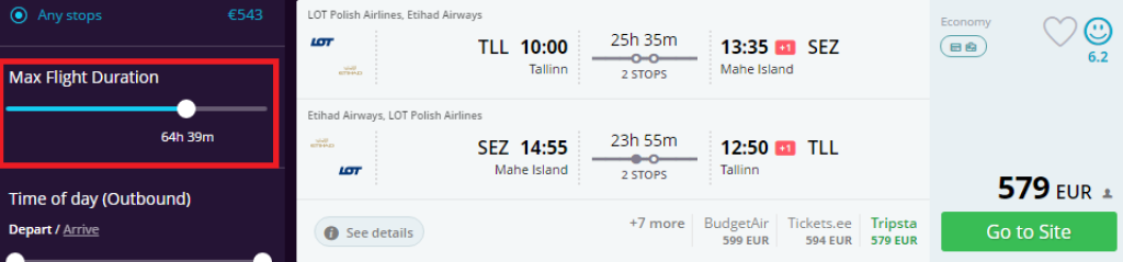 NB! Momondo kuvab soodama hinnaga pileteid eelisjärjekorrasn(pikad ümberistumised). Selleks aga, et leida paremate lennuaegadega piletid, tuleb vasakpoolses menüüs vastava nupu "Max Flight Duration" abil lennuaega optimeerida.