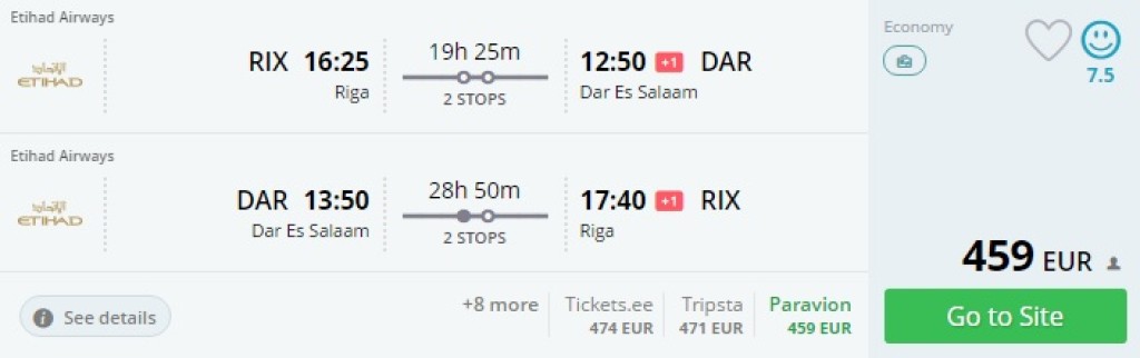 Maailma üks parimaid lennufirmasid Etihad Airways pakub jaanuarist kuni märtsi keskpaigani pileteid Riiast Tansaania pealinna Dar Es Salaami hinnaga al. 459€. Soodsaid pileteid leiab lendudele mõlemas suunas nädala alguses. Nagu Etihadiga tavaks, mõned lisaeurod aitavad ümberistumisi lühendada. Dar Es Salaamist saab minna kas põhja- või lõunapoolsetesse rahvusparkidesse ja Sansibari saarele.