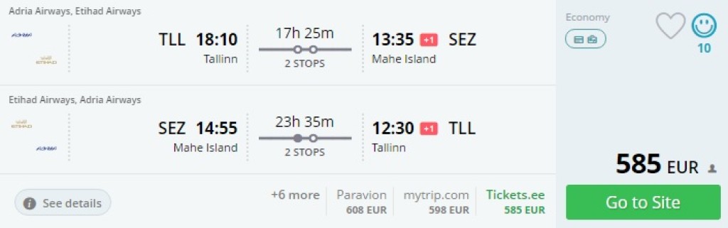 Äsja 5* lennufirmaks nimetatud Etihad Airways pakub pileteid Riiast ja Tallinnast Seišellide pealinna Mahesse hinnaga alates 519€. Pileteid on saada ka mõni euro odavamalt, kuid oluliselt pikemate ümberistumistega. Alltoodud hinnad on mugavama ühenduse kohta. Pileteid on saada kuni järgmise aasta aprillini, v.a. aastavahetuse periood.