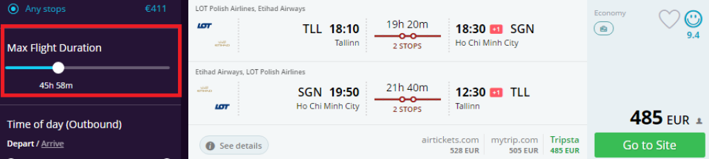 NB! Momondo kuvab soodama hinnaga pileteid eelisjärjekorrasn(pikad ümberistumised). Selleks aga, et leida paremate lennuaegadega piletid, tuleb vasakpoolses menüüs vastava nupu "Max Flight Duration" abil lennuaega optimeerida.