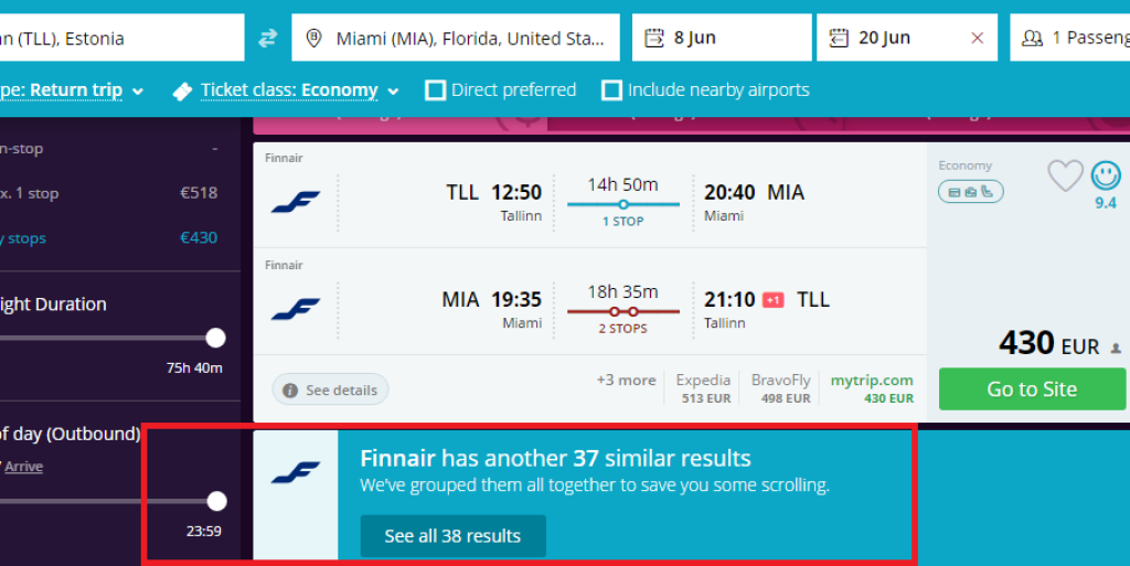 NB: ühe ja kahe ümberistumisega lennupiletite hinnavahe on kõigest mõni euro. Parimate pakkumiste ülesleidmiseks klikkge valikus "See all x results":