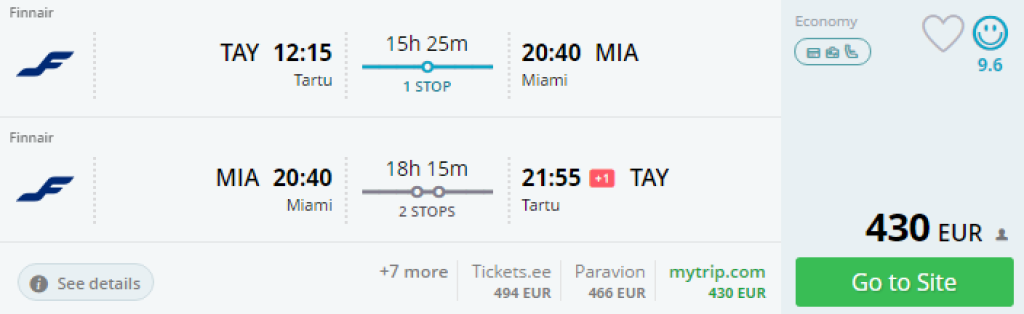 Soodne pakkumine Floridasse: lennupileteid Tallinnast või Tartust Miamisse hinnaga al. 430€. Kohale viib Finnair ning leidub ühe või kahe ümberistumisega lennupileteid.. Hea hinnaga pileteid leiad lendudele mais- juunis ning septembris läbi momondo.