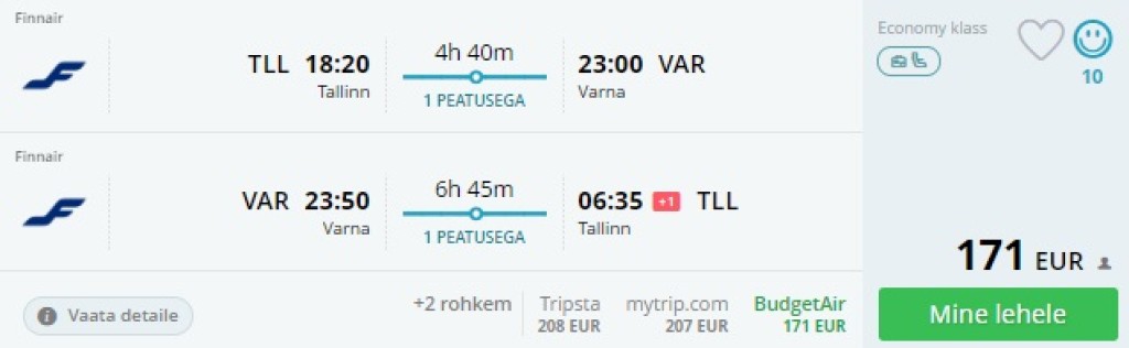 Finnair pakub hetkel hea hinnaga lennupileteid juuliks-augustiks Tallinnast Kuldsetele liivadele, Varnasse. Edasi-tagasi lennupiletid on saadaval alates 171€ eest ning lennud on ühe ümberistumisega Helsingis mõlemal suunal. Parima hinnaga lennupiletid leiad üles läbi Momondo.ee või kliki allolevatel näidiskuupäevadel.