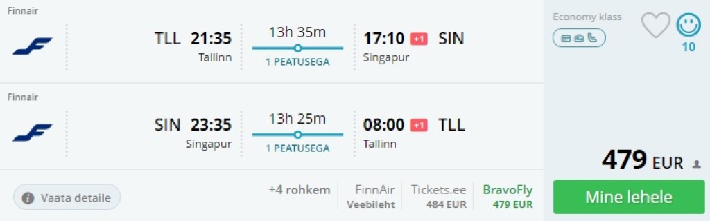 Finnair pakub praegu lennupileteid nii Tallinnast kui Tartust Singapuri hinnaga 479€. Enamikel päevadel on tegemist kiirete ümberistumistega Helsingis, lennates Tartust sõltub ümberistumise pikkus lennupäevast. Pileteid on saada märtsist kuni juuni lõpuni ja uuesti alates septembrist novembri lõpuni. Müügiperiood kestab 14. veebruarini.