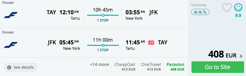 Finnair pakub hetkel soodsaid lennupileteid Tallinnast Tartust New Yorki, Miamisse, Los Angelesse. Edasi- tagasi lennupiletite hinnad al 395€. Saadavus varieerub sõltuvalt sihkohast, kuid tasub otsida septembrist juunini. Soodsad lennupiletid leiad läbi momondo või kasuta otselinke allpool. Ümberistumiste kestvus erinevate lennukuupäevade puhul varieerub, leidub ohtralt mugavaid variante nii Tallinnast, kui ka Tartust.