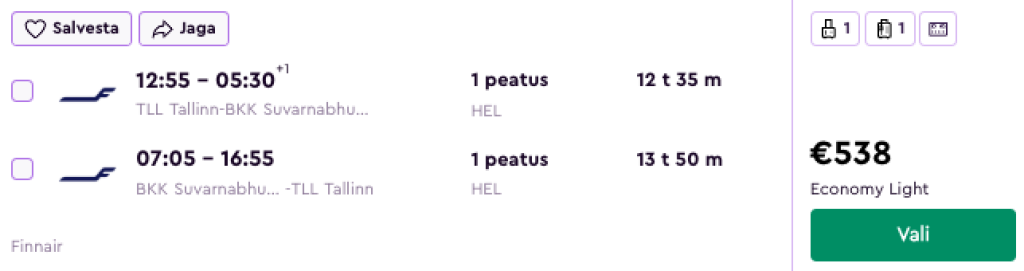 Finnair pakub hetkel suurepärase hinnaga lennupileteid Tai Kuningriiki. Soodsaimad ühe kiire ümberistumisega edasi-tagasi lennupiletid Tallinnast Bangkokki on saadaval alates 538€ eest ja Tartust 616€ eest.