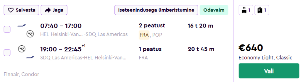 Condor koostöös Finnairiga pakuvad hetkel atraktiivse hinnaga lennupileteid Kariibi mere saarele, Dominikaani Vabariiki. Edasi-tagasi lennupiletid Helsingist Puerto Platasse ja Santo Domingosse on saadaval alates 633€ eest.