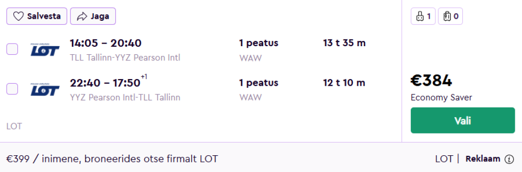 LOT pakub hetkel käimasoleva kampaania raames väga hea hinnaga lennupileteid Kanadasse. Ühe kiire ümberistumisega lennupiletid Tallinnast Torontosse on saadaval alates 384€ eest.