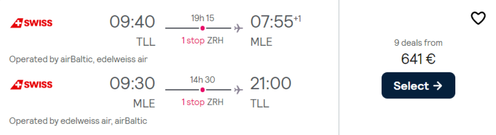 Lufthansaga koostöös SWISSiga pakuvad hetkel suurepärase hinnaga lennupileteid Maldiividele. Edasi-tagasi lennupiletid algusega Tallinnast on saadaval alates 641€ eest. Ühe mugava ümberistumisega lennupileteid leiab puhkusreisiks jaanuaris ja aprillis-mais ning septembris-oktoobris.
