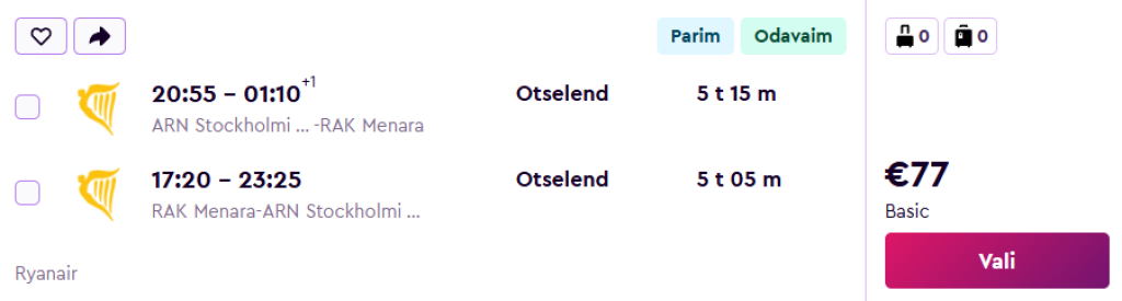 Ryanair pakub hetkel väga hea hinnaga otselende Marokosse. Edasi-tagasi lennupiletid Stockholmist Marrakechi on saadaval alates 77€ eest.