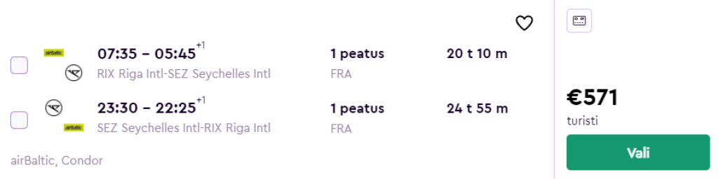 Condor koostöös airBalticuga pakuvad hetkel suurepärase hinnaga lennupileteid Seišellidele. Edasi-tagasi lennupiletid algusega Riiast on saadaval 571€ eest. Soodsad lennupiletid on leitavad jaanuaris. Lennud on pikema päevase ümberistumisega Frankfurdis, mis annab samas hea võimaluse ka selle suurlinnaga tutvumiseks. Lennupiletite hinna sees on toitlustus pardal ja äraantav pagas 20kg.