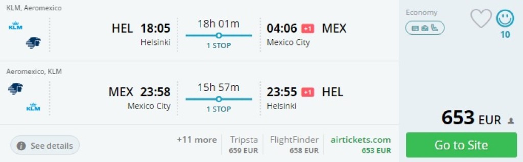 Hetkel on saadaval KLM/Air France’i ja Lufthansa lennud Helsingist Mexico Citysse al. 612€. Mõlemal juhul leiab küllaltki kiirete ümberistumistega lende kas Amsterdami/Pariisi või Frankfurti kaudu. Lufthansa lendude miinuseks on varased väljumised ja hilised tagasijõudmised Helsingis, ka AF/KLM-i lennud saabuvad kohati hilja. Muide, saadaval on lennud ka jõulude ja aastavahetuse perioodil. Lende leiab kuni 2017. a. aprilli alguseni.