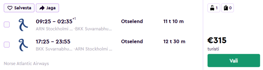Norse Atlantic Airways pakub suurepärase hinnaga lennupileteid Taisse. Edasi-tagasi otselennud Stockholmist Bangkokki on hetkel saadaval alates 315€ eest.