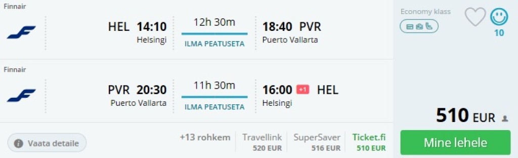 Finnair on jälle avanud - ja varasemast odavamalt! - broneeringud lendudele Mehhikos Vaikse ookeani ääres asuvasse kuurortlinna Puerto Vallartasse. Tegemist on hooajaliste lendudega, mis toimuvad kord nädalas pühapäeviti perioodil 5. november 2017 kuni 18. märts 2018. Mugavate ümberistumistega lendudel on kasutusel uus Airbus A350 lennuk. See on konkurentsitult kiireim võimalus Tallinnast startides juba samal päeval Vaikses ookeanis ujuda ja maitsta mariachi muusika saatel suurepärast Jalisco kööki.
