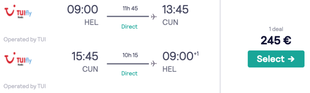 Hinnasula!Soome reisikorraldaja TUI pakub hetkel hea hinnaga lennupileteid otselendudele Helsingist Mehhikosse. Edasi-tagasi lennupiletid Helsingist Cancuni vahemikus 01.03-15.03 on saadaval 245€ eest. Lennupiletiteni jõudmiseks kliki allolevatel näidiskuupäevadel.NB! Soodsate lennupiletite arv on piiratud!