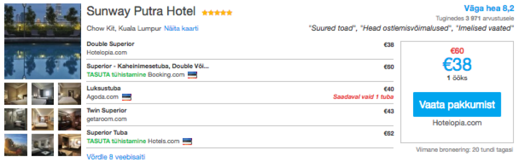 Hetkel leiab väga hea hinnaga hotellipakkumise Malaisia pealinnas Kuala Lumpuris 5* hotellis Sunway Putra Hotel, kus double superior toa hinnaks on vaid 38€ ehk 19€/per person. Soodsa hinnaga öömaja leiab nii sügisel kui talvel. Ööbimise endale sobivatel kuupäevadel leiad üles läbi HotelsCombined.ee