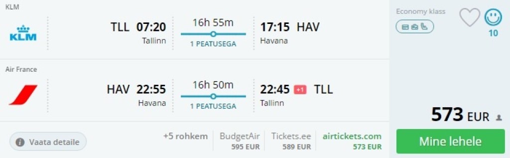 KLM ja Air France pakuvad detsembris ja jaanuaris lennupileteid Tallinnast Havannasse hinnaga alates 573€. See on hea võimalus veeta jõulud Kuuba päikese all! Kiirete ümberistumistega lennud toimuvad kas Amsterdami või Pariisi kaudu. Paralleeleselt on saada ka Aerofloti võrreldava hinnaga pileteid, kuid lennuplaani tõttu on Moskvas pikemad ümberistumised mõlemal suunal. Startides Riiast, leiab ka paremaid ümberistumisaegu. Kõik allpool välja toodud hinnad on kiireima lennuvõimaluse puhul, mis ei pruugi alati olla Momondo tulemustes esimene.