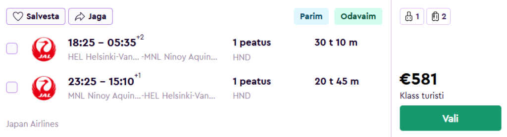 Japan Airlines pakuvab hetkel väga hea hinnaga lennupileteid Filipiinidele. Edasi-tagasi lennupiletid Helsingist pealinna Manilasse on saadaval alates 581€ eest.
