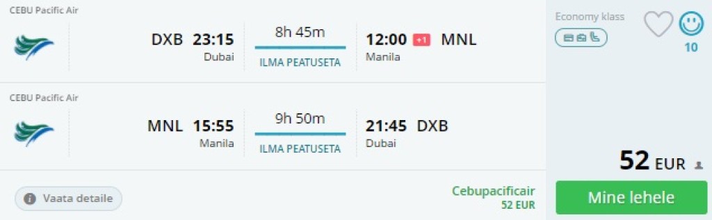 Cebu Pacific pakub hetkel supersoodsaid lennupileteid Dubaist Manilasse: edasi- tagasi lennupiletid (otselennud) on saadaval hinnaga al 52€. saadaval ohtralt lennukuupäevi novembris- detsembris. Sinna juurde saad sobitada Norwegiani otselennud Helsingist Dubaisse, mille hinnad algavad 179 eurost. Tähele tasub panna, et odavaima hinnaklassipiletid ei sisalda toitlustamist pardal, ega äraantavat pagasit. Piletiteni jõudmiseks kliki näidiskuupäevadel allpool või kontrolli endale sobivaid lennukuupäevi läbi momondo.