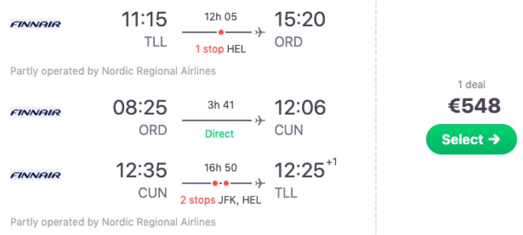 Finnair koostöös American Airlinesiga pakuvad hetkel väga hea hinnaga lennupileteid külastamaks Cancuni ning Miamit või Chicagot. Lennupiletid on saadaval alates 548€ eest ning soodsa hinnaga lennupileteid marsruudil Tallinn-Miami-Cancun-Tallinn leiab märtsis ja lennupileteid marsruudil Tallinn-Chicago-Cancun-Tallinn oktoobris. Piletiteni jõudmiseks kliki allpool olevatel näidiskuupäevadel või kontrolli endale sobivaid lennukuupäevi läbi Skyscanneri