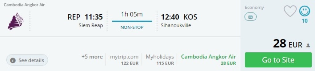 Kambodža rahvuslik lennufirma Cambodia Angkor Air pakub praegu väga soodsalt Kambodža siselende Siem Reapi ja Sihanoukville’i vahel. Ühe suuna pilet Siem Reapist rannikule maksab 8 USD, koos maksudega 28€. Edasi – tagasi reis maksab 55€ ehk pea sama palju, kui sõit bussiga. Ajasääst on samas ikka suurepärane.