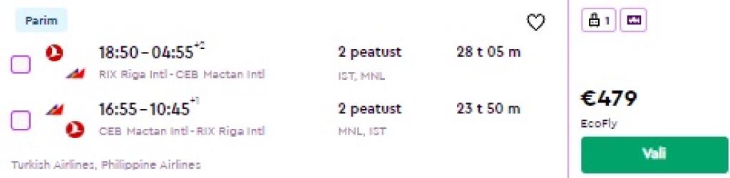 Turkish Airlines pakub hetkel soodsa hinnaga lennupileteid Filipiinidele. Edasi-tagasi lennupiletid Tallinnast või Riiast Cebusse on saadaval al 479€ eest ning ohtralt hea hinnaga lennupileteid leiab novembris-detsembris (sh jõulud) ning taas alates märtsist kuni juunini. Lennupiletite hinnas sisaldub ka äraantav pagas ning toitlustamine lennukite pardal. Lennupiletite ostmiseks kliki allolevatel lennukuupäevadel või kontrolli endale sobivaid kuupäevi momondo.ee.