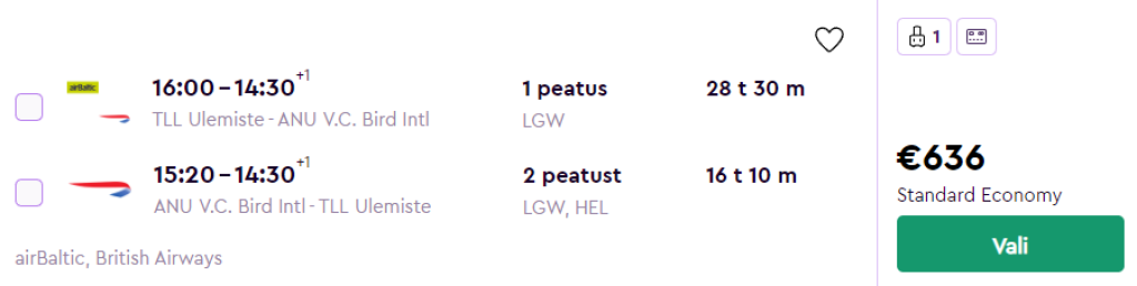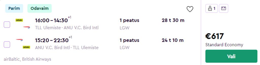 British Airways koostöös Finnairi ja airBalticuga pakuvad hetkel suurepärase hinnaga lennupileteid Kariibidele. Edasi-tagasi lennupiletid Tallinnast Antigua ja Barbuda suurimale saarele Antiguale on saadaval alates 617€ eest. Lennupiletite hinna sees on ka äraantav pagas ja toitlustus pardal. Soodsa hinnaga lennupileteid leiab reisimiseks sügisel ja kevadel. Miinuseks on pikem ümberistumine Londonis. Parima hinnaga lennupiletid leiad üles läbi Momondo.ee