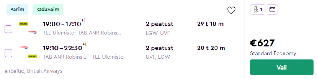 British Airways koostöös Finnairi ja airBalticuga pakuvad hetkel suurepärase hinnaga lennupileteid Kariibidele. Edasi-tagasi lennupiletid Tallinnast Trinidad ja Tobago saartele on saadaval alates 627€ eest. Lennupiletite hinna sees on ka äraantav pagas ja toitlustus pardal. Soodsa hinnaga lennupileteid leiab reisimiseks sügisel ja kevadel. Miinuseks on pikem ümberistumine Londonis. Parima hinnaga lennupiletid leiad üles läbi Momondo.ee