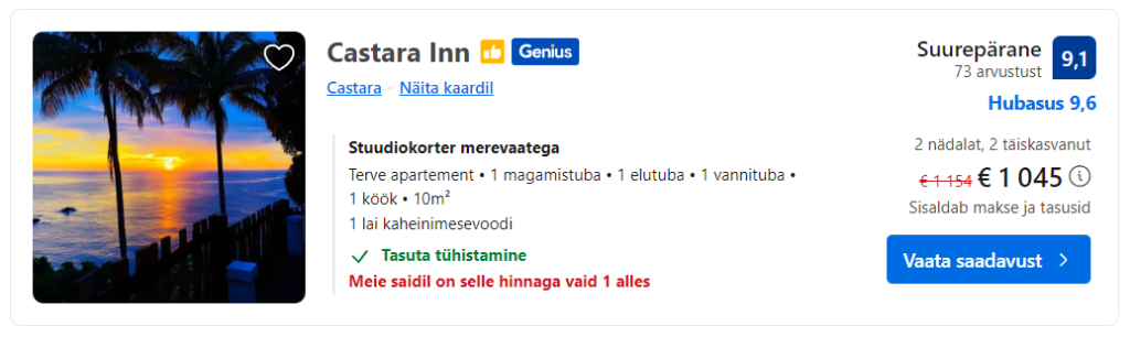 NB! Bookingus kehtivad väga paljudele majutustele Genius-soodustused. Loo kasutaja ning saa osa lojaalsusprogrammi soodustustest.