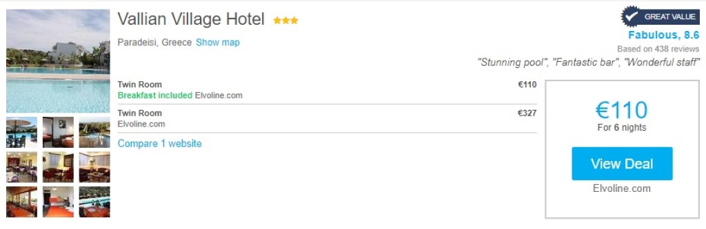 HinnanäideHeade hinnangutega hotell Vallian Village kahele inimesele 6 ööks koos hommikusöögiga (kontrollitud kuupäevad 24.05-30.05) maksab kokku 110€ ehk 55€/inimene. See teeb lennupiletite ja majutuse kogumaksumuseks kokku 207€.