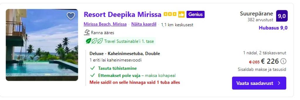 Kui otsid soodsa hinnaga majutust Sri Lankal, siis soovitame parima ülevaate ja hinna saamiseks kasutada majutushindade võrdlusportaali Booking.com