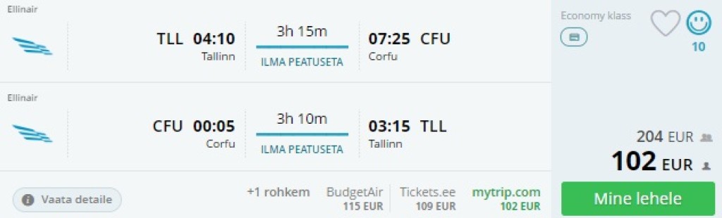 Edasi-tagasi otselennud suvel Tallinnast Korfu saarele on saadaval vaid 102€ eest. Lennufirmaks Ellinair ning piletihinna sees on ka äraantav pagas. Otsisime välja ka väga hea hinna ning reitinguga majutussoovituse. Tõime välja kõik võimalikud reisikuupäevad. Lennupiletite ostmiseks kliki allpool olevatel näidiskuupäevadel või otsi need ise läbi momondo.ee