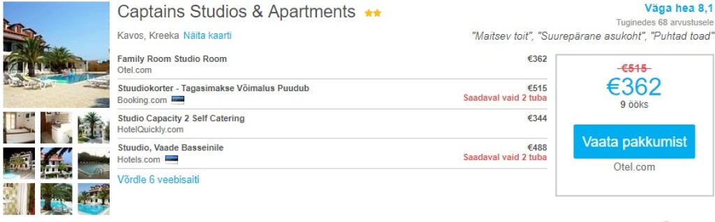 ####Hotellipakkumised KorfulKõikide kuupäevade puhul on võimalik veeta Korful 10 päevane puhkus. Otsisime välja läbi hotellihindade võrdlusportaali Hotelscombined.ee hea reitingu ning hinnaga hotellisoovituse üheksaks ööks. Sobivad lennupiletid vahemikus 28.06-08.07 leiad SIIT.Meie soovitus on:Captains Studios & Apartments - Tuba kahele väga hea reitinguga hotellis maksab üheksaks ööks 362€. Lisainfo ja broneerimine