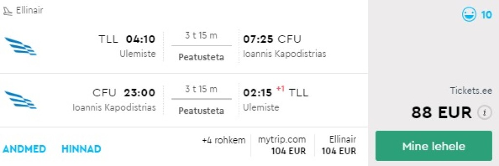 Ellinair pakub väga soodsaid otselende Korfule. Edasi-tagasi lennupiletid Tallinnast leiab üles alates 88€ eest. Saadaval on soodsad lennupiletid vahemikus 29.07-08.08 88€. Piletihinnas sisaldub äraantav pagas!