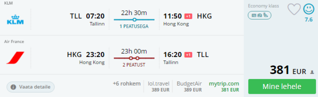 Hetkel on saadaval väga soodsad lennupiletid Tallinnast Hongkongi! Edasi- tagasi lennupiletite hinnad algavad 381 eurost. Saadavus novembrist kuni jaanuarini. Hongkongist saab soovi korral soodsalt edasi lennata nii Filipiinidele kui mujale Kagu-Aasias ja Hiinas. Piletiteni jõudmiseks leidmiseks kasuta otselinke allpool või otsi lennupiletid üles momondo abil.