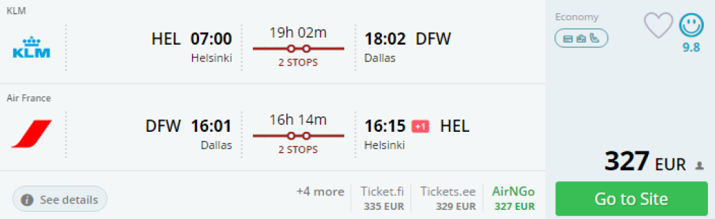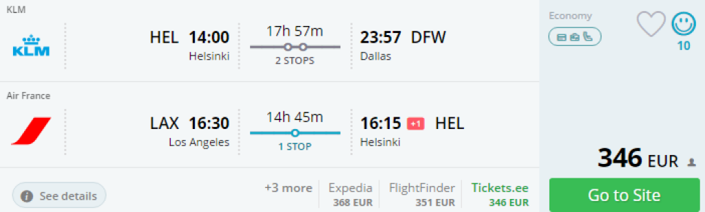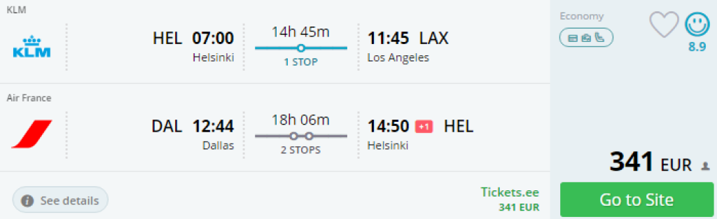 Lisaks teemale KLM/ AF edasi- tagasi Helsingist Miamisse al 322€ toome teieni ka väga hea hinnaga lennupiletid Helsingist Los Angelesse ja Dallasesse . Hinnad al 327€. Lennufirmad KLM/ Air France ning saadavus on märtsist juuni alguseni. Saadaval ka erinevad "open- jaw" variandid, mis on ideaalsed korraldamaks üks vinge roadtrip! Lennud ühe või kahe ümberistumisega. Lennupileteid leiad läbi momondo