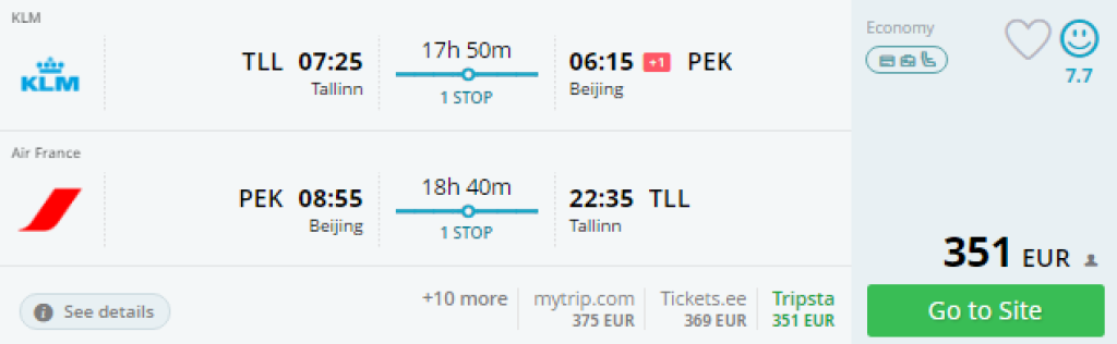 KLM ja Air France pakuvad lennupileteid Tallinnast Pekingisse hinnaga 351€. Lennud on ühe ümberisumisega Amsterdamis/Pariisis ning saadavus on märts kuni juuni. Soodsad lennupiletid leiad läbi momondo või kasuta otselinke allpool.