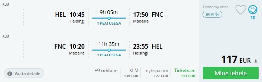 KLM pakub novembris ja jaanuaris lennupileteid Helsingist Madeirale hinnaga 117€. Lennud toimuvad üle Amsterdami, saadavus on üsnagi korralik, kuid paljudel kuupäevadel tuleb vähemalt 1 öö Amsterdamis olla. Allpool on ära toodud kuupäevad, kus ööbimine Amsterdamis pole vajalik.