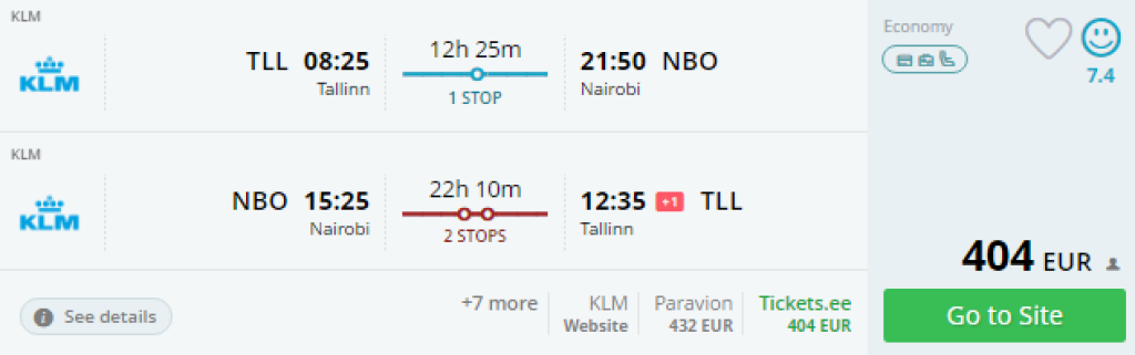 KLM pakub soodsaid lennupileteid Tallinnast Keeniasse, Nairobisse alates 404€. Saadavus on november kuni aprill.
