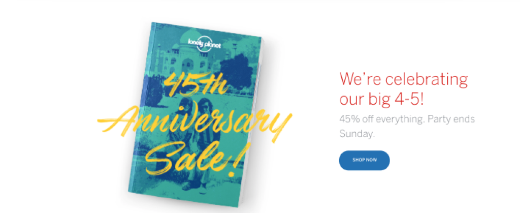 Lonely Planet pakub oma 45. sünnipäeva puhul kõiki tooteid 45% soodsamalt. Soodustus kehtib nii paber- kui e-raamatutele. Kampaania kestab kuni pühapäevani, 28.10.2018. Soodustust on näha raamatut soetades.