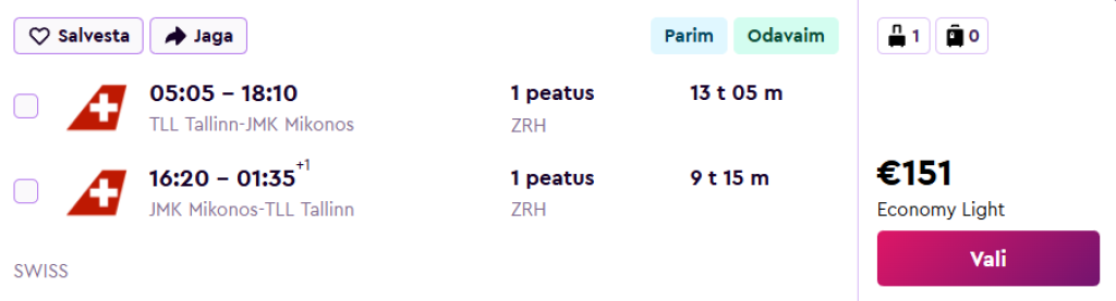 SWISS koostöös Lufthansaga pakuvad hetkel hea hinnaga lennupileteid Kreekasse. Edasi-tagasi lennupiletid Tallinnast Mykonose saarele on saadaval alates 151€ eest.