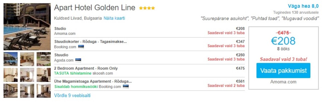 Hotellisoovitus: korralik stuudiokorteritega hotell Golden Line Kuldsetel Liivadel maksab kuupäevadel 12.09-20.09 (8 ööd) 208€. Lennupiletid ja hotell ühele inimesele kokku maksab toodud kuupäevadel 333€. Kuna saabumine/lahkumine on öösel, on majutuse sisse arvestatud ka saabumise ja lahkumise öö.