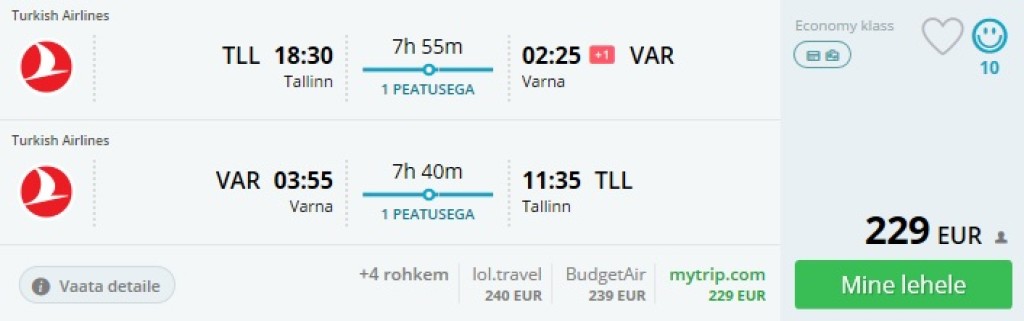 Turkish Airlinesi lendudega saab septembris Tallinnast Musta mere äärde Varnasse lennata hinnaga 229€. Saadavus on piiratud, allpool on näited lendudest, mis on kiirete ümberistumistega.