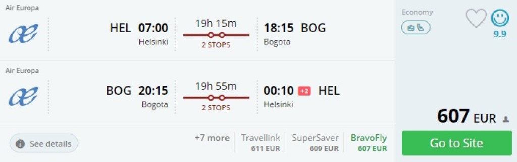 Air Europe pakub lennupileteid Helsingist Kolumbia pealinna Bogotasse hinnaga 609€. Saadaval on piletid lendudel jaanuarist kuni juunini. Lennud on kahe üsna lühikese ümberistumisega (sõltub siiski lennu kuupäevast) Amsterdamis ja Madriidis, Euroopas opereerib lende KLM.