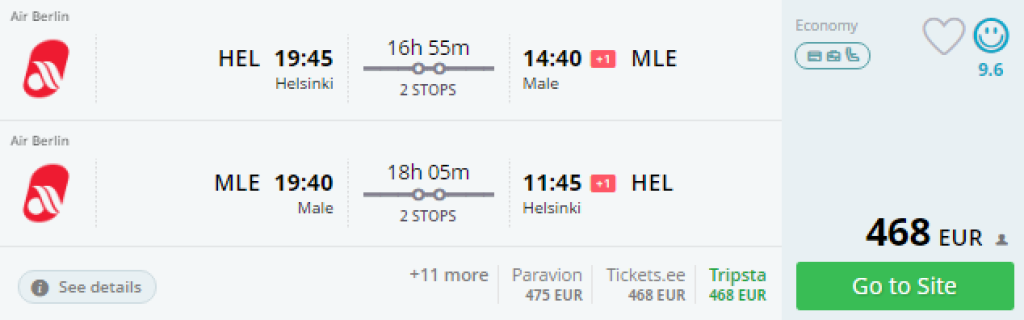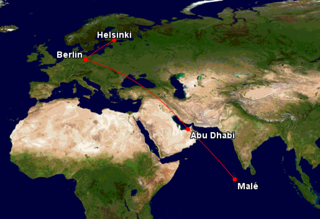 Hetkel saadaval väga soodsad lennupiletid Etihadi ja Air Berliniga Helsingist Maldiividele. Edasi -tagasi lennupiletid maksavad al. 468€ ning saadavus on septembrist veebruarini! Kiired ümberistumised toimuvad Berliinis ning Abu Dhabis.