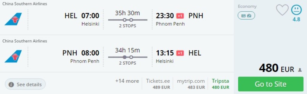 China Southern Airlines pakub lennupileteid Helsingist Kambodža pealinna Phnom Penhi hinnaga 480€. Lennud toimuvad üle Amsterdami ja Pekingi. Saadavust on küllaltki hea, kuid suhteliselt lühikese perioodi jooksul oktoobri lõpust kuni detsembri alguseni.