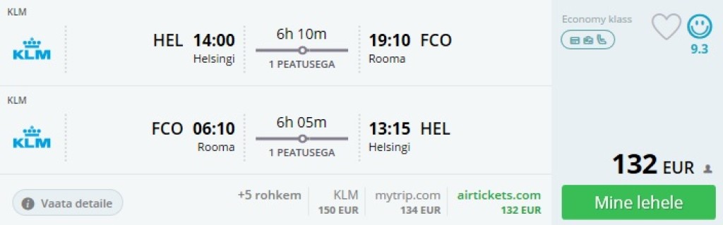 Helsingist võib praegu mitme lennufirmaga leida soodsaid pileteid Rooma. Novembrist kuni märtsi lõpuni (v.a. detsembri keskpaigast jaanuari alguseni) pakub KLM lende Amsterdami kaudu Rooma hinnaga 132€. Lendude kellaajad sõltuvad päevast ja osadel päevadel jõuab lennuk tagasi Helsingisse vahetult enne südaööd. Saadaval on ka lennud, kus lennuk väljub Roomast hommikul ja Helsingisse saabutakse lõunaks.