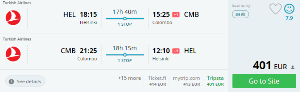 Turkish Airlines pakub pileteid Helsingist Colombosse hinnaga 401€. Kuupäevavalik pole kõige suurem, häid hindu võib leida väljalendudele novembris 2016. Valik on parim novembri teises pooles. Lennud on ühe ümberistumisega Istanbulis.
